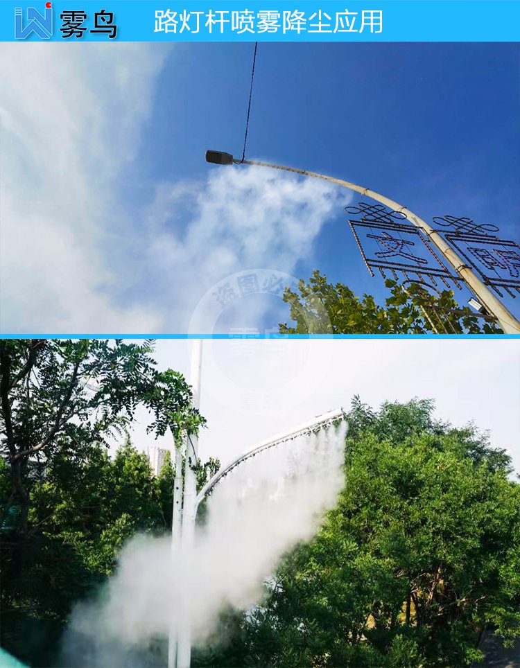低壓噴霧系統,主要用于噴霧降塵領域,可以用于路燈桿噴霧降塵、車間內噴霧降塵、建筑工地圍擋噴霧降塵、道路降塵等領域,系統采用8-15公斤壓力,噴霧霧滴顆粒直徑20-100微米,低壓噴霧設計噴嘴孔徑相對較大不易堵塞,噴霧顆粒度相對較大,抗風抗蒸發能力強,有較大濕潤感覺,只針對降塵、加濕、降溫效果明顯。