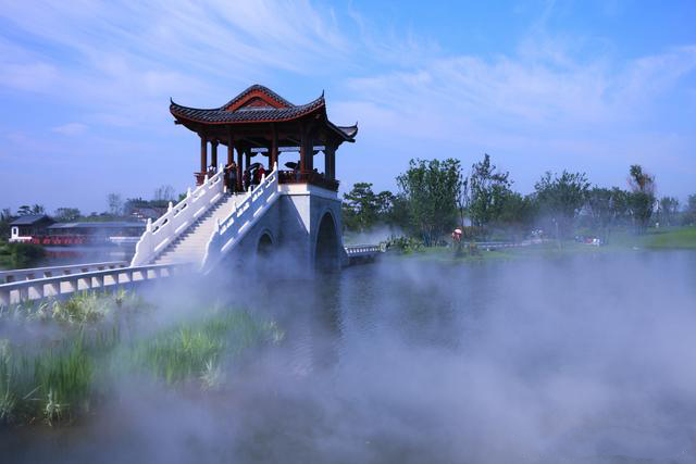 在亭臺樓閣休閑一角也能體會到霧森系統的魅力!霧從橋下升騰而出,朦朦薄霧,宛若仙女身上的紗帶,在裊裊飄動。輕輕抓一把,軟綿綿的白霧頃刻間消失不見,留在手中的只剩下冰冰涼涼的觸感。