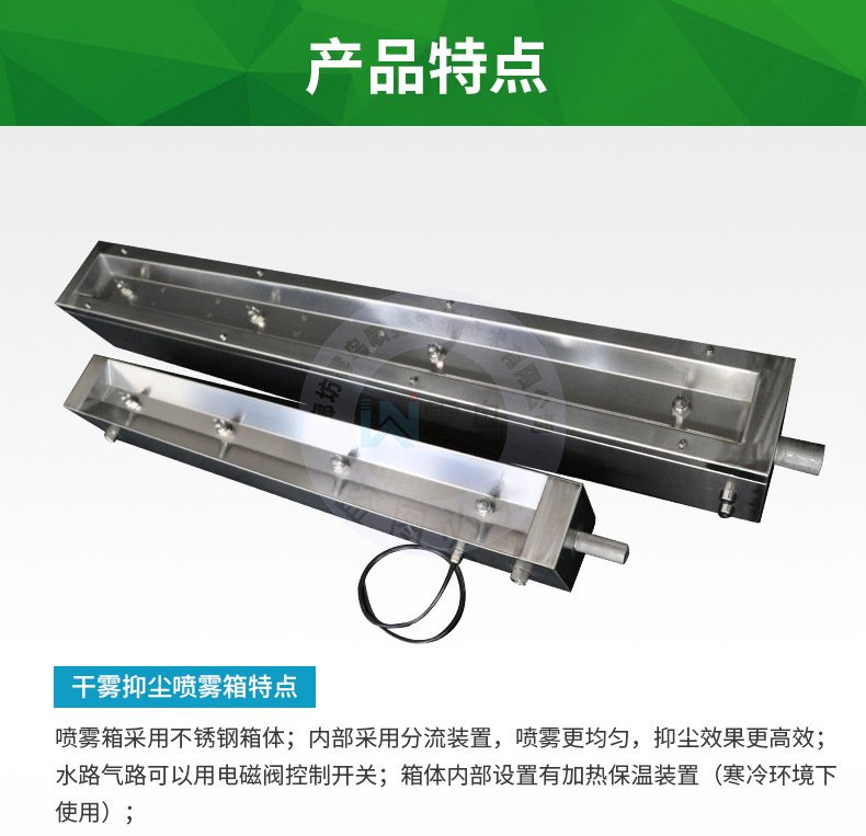 干霧箱采用304不銹鋼箱體,內部采用水路、氣路分流裝置,噴霧更均勻。箱體內可設置加熱保溫裝置。每個箱體安裝4-8個干霧噴嘴。